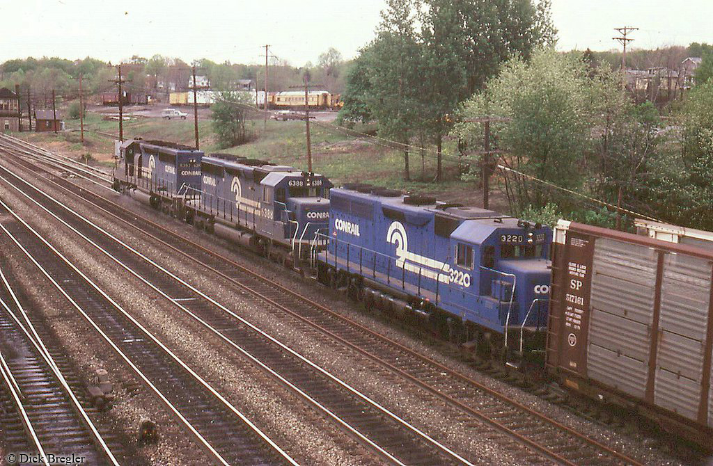 Conrail SD40-2 6397 is leading CR GP40 3220 (ex-PC 3220) and CR SD40-2 6388 on an eastbound mixed freight at Cresson, PA in 1981. MO tower is at the left edge of the picture, with MOW equipment in the yard in the background.