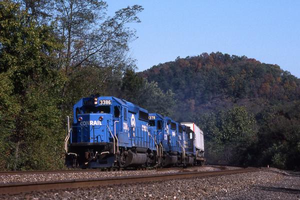 CR 3386 leads a westbound intermodal at Newport PA, 10/12/89