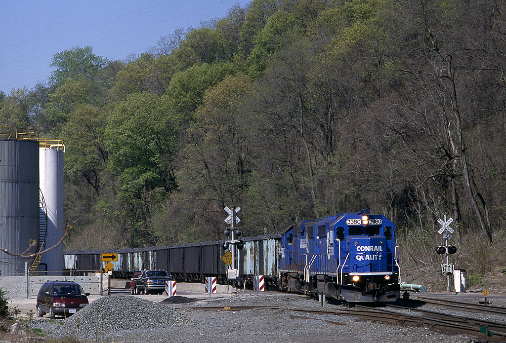 CR 3380 leads a loaded USS coke train that originated just a few miles down the line at the Clairton Coke Works. The train is passing Boswell Oil in Dravosburg, PA on the Mon Line on 5/1/1999, Conrail's final month.
