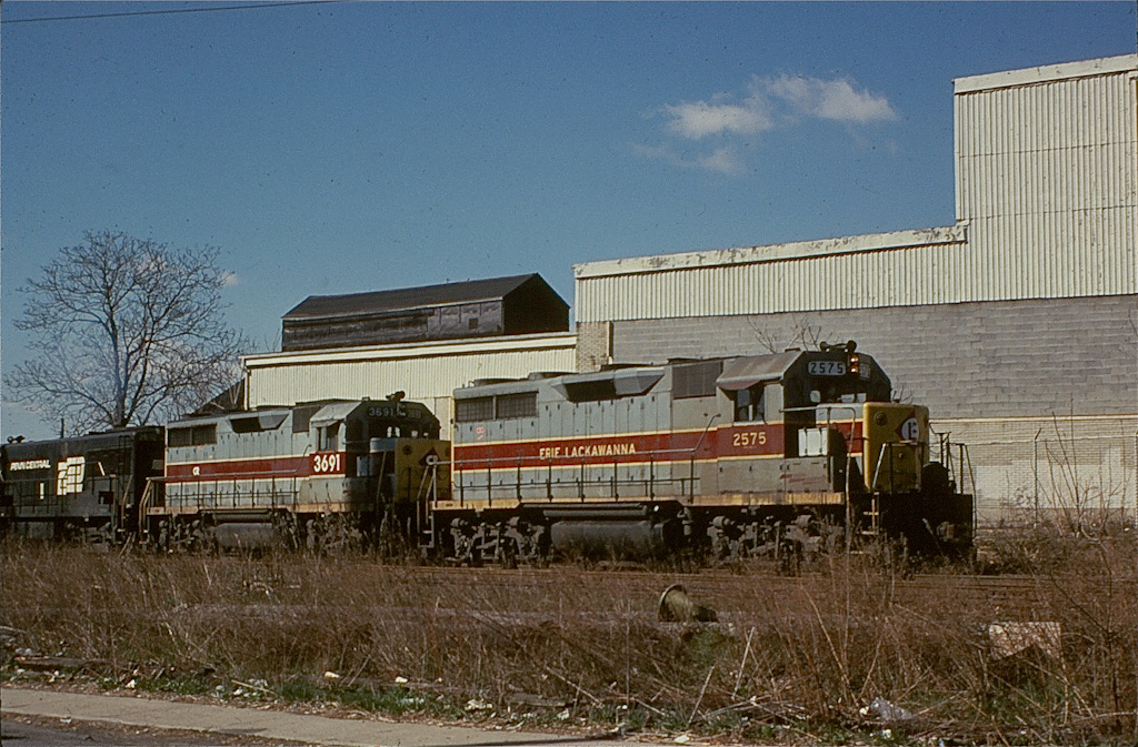 EL GP-35 2575 (CR 3681) leads sister-unit 3691 (ex-EL 2585) and a PC U-boat through Bethlehem in April, 1977.