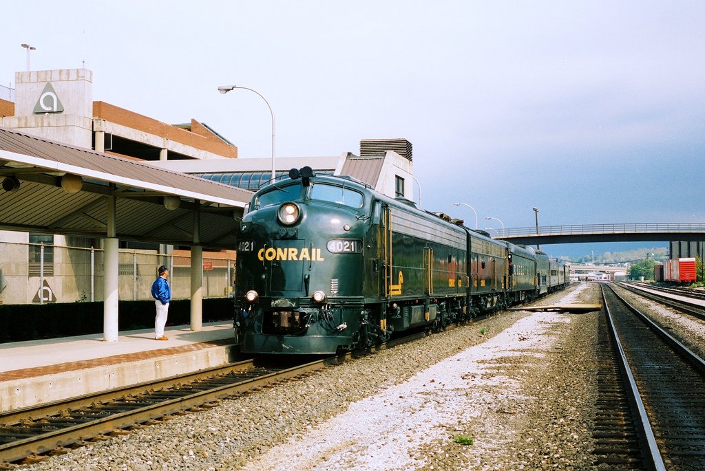 Conrail OCS Train at the Altoona Station behind E8As Nos. 4021 and 4020, on October 1, 1994. Doug Davidson photo with permission