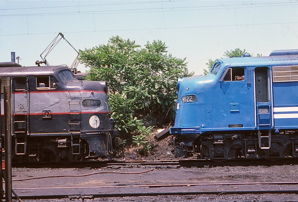 Two CR predecessors meet nose to nose at South Amboy, NJ in June, 1980. Former PRR E-8A 5836 meets EL E-8A 833, but now it's NJDOT 4246 faces CR 4022. The ex-PRR unit would last another two years before retirement while the EL E-8A still had a storied CR career through the 90's.