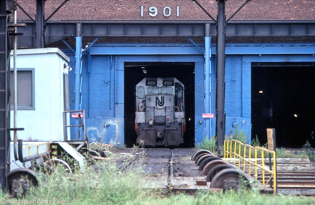 CR-operated NJDOT GP40P 4100 (ex-CNJ 3671) rests inside the Elizabethport shops in July, 1981.