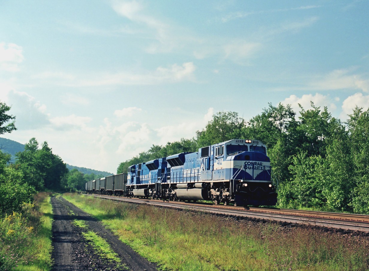 The 4112 and mate take an empty ballast train eastward through State Line in Canaan, NY. on Aug. 17, 1996.