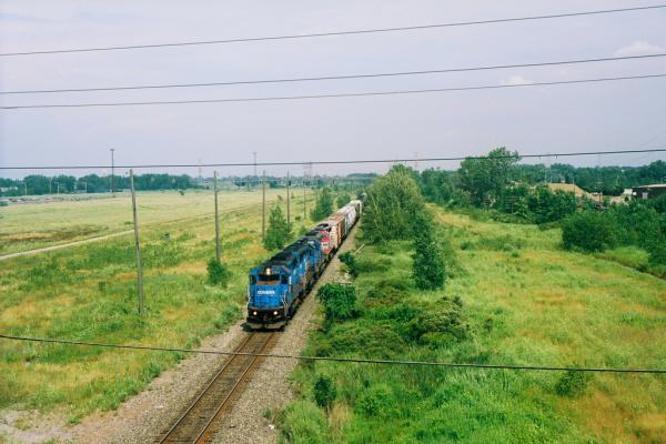 A pair of Conrail SD80MACs led by No. 4117 head a westward trailer train on the former New York Central at Angola, NY, in August 1997. Doug Davidson photo with permission