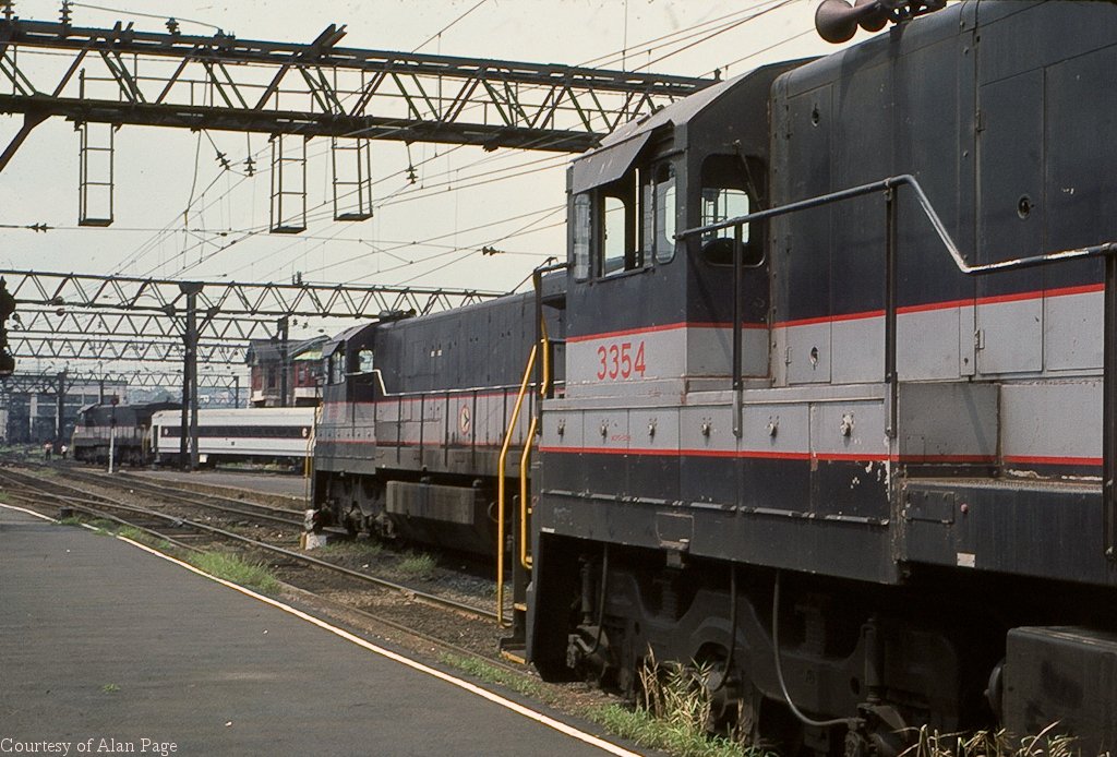 A trio of CR-operated former EL U34CH's and their Comet I cars lined up awaiting departure at Hoboken in August, 1977.