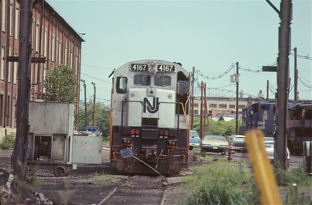 NJDOT U34CH 4167 (ex-EL 3367, refurbished by Conrail) rests outside the Elizabethport shops in July, 1981.