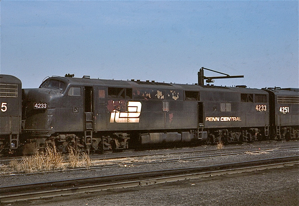 CR-operated former PC E-7A 4233, looking very worn and needing paint, sits in a line of E-units at South Amboy in March, 1978.