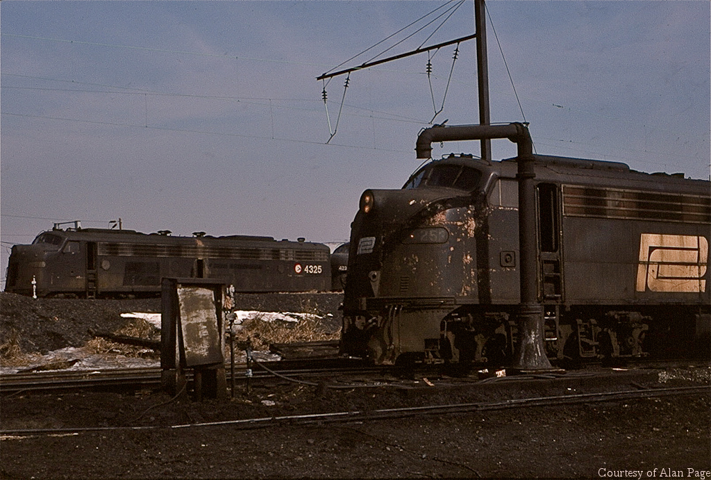 NJDOT E-8A 4325 alongside PC 4253 at the South Amboy engine terminal in March, 1978.