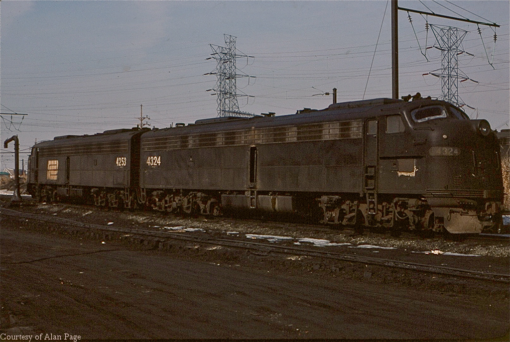CR-operated former PC E-8A's 4253 and 4324 are lined up ready for commuter service at South Amboy in March, 1978.
