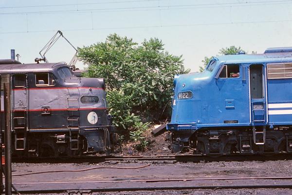 A busy engine terminal at South Amboy in March, 1978 shows E-7A 4244, E-8A 4328 and others, GP40P 3682 (CR 4111), and GP40 3130 lined up readying for service to South Amboy staton.