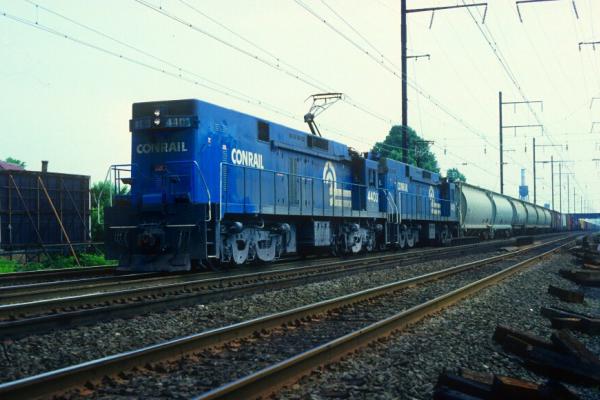 PC E-44 4445 takes up the rear in a duo of electrics pulling freight towards Morrisville near Willow Grove in March, 1977.