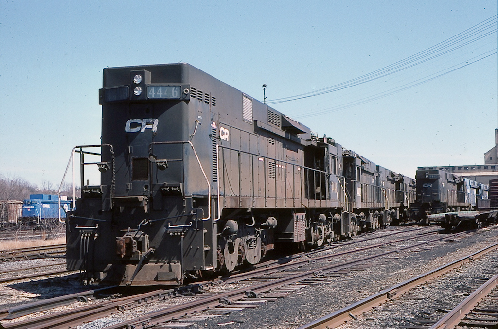 CR E-44 electric 4446 rests with stored sister units at Rutherford in April, 1984.