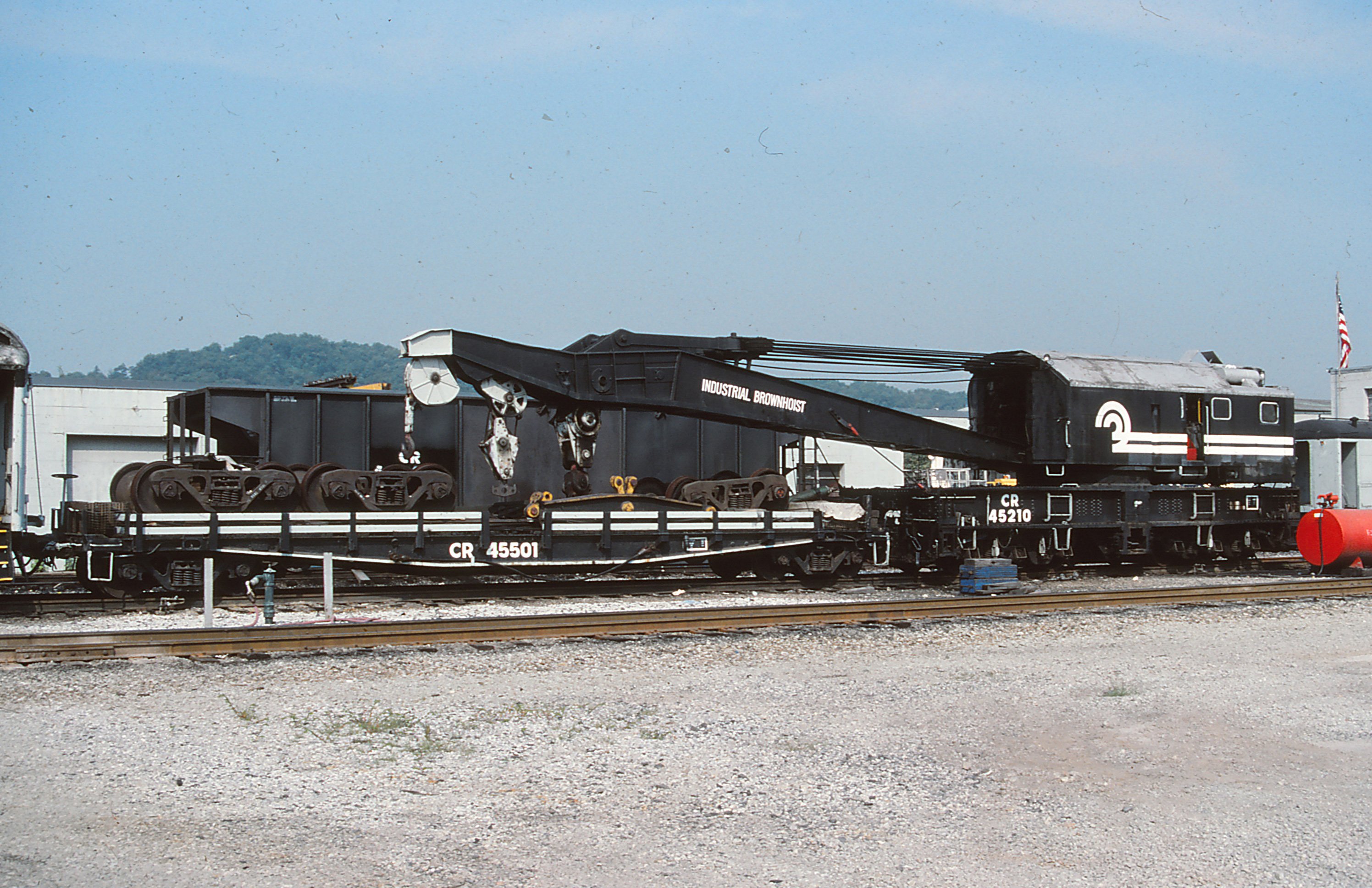 CR 45210 and its idler CR 45501 are seen at Conway, PA on June 10, 1990. Crane is ex ERIE 3302, built 12-54 and currently resides at the Pennsylvania Railroad Musuem in Strasburg, PA.