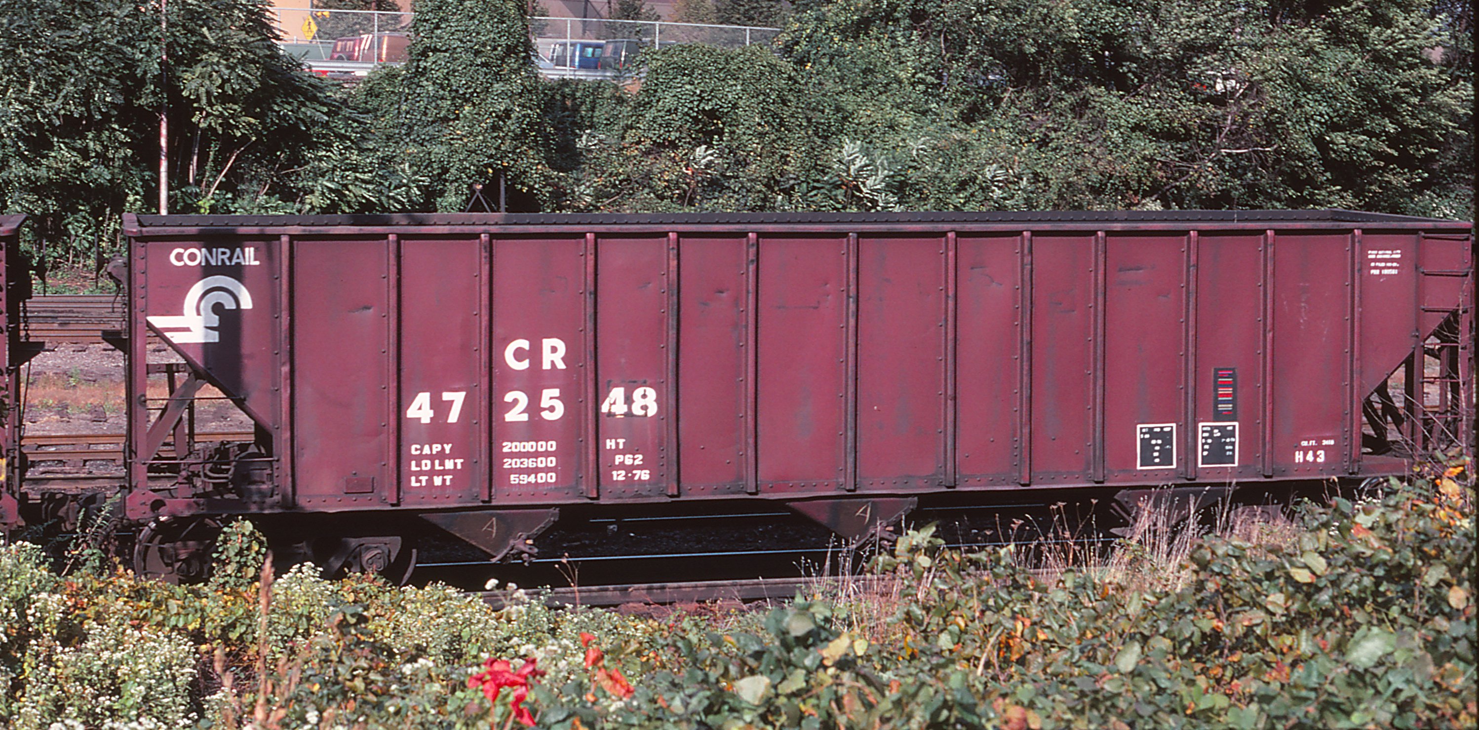CR 472548 is seen at Bethlehem, PA In Oct of 1981. Car is ex PRR 180581, built 5-64 and was painted P62 12-76. It was rebuilt to a G52L class Coalporter at Hollidaysburg in April of 1991 and became CR 503818 which was later deleted 8/31/02 by NS.