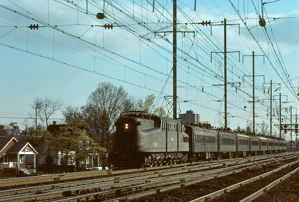 CR GG-1 4858 pulls a string of nine 1929-1930 vintage Reading MU's through Morrisville on their way to 30th Street Station in April, 1977, during the 44-day March 25 to May 8 Septa City Division transit strike.