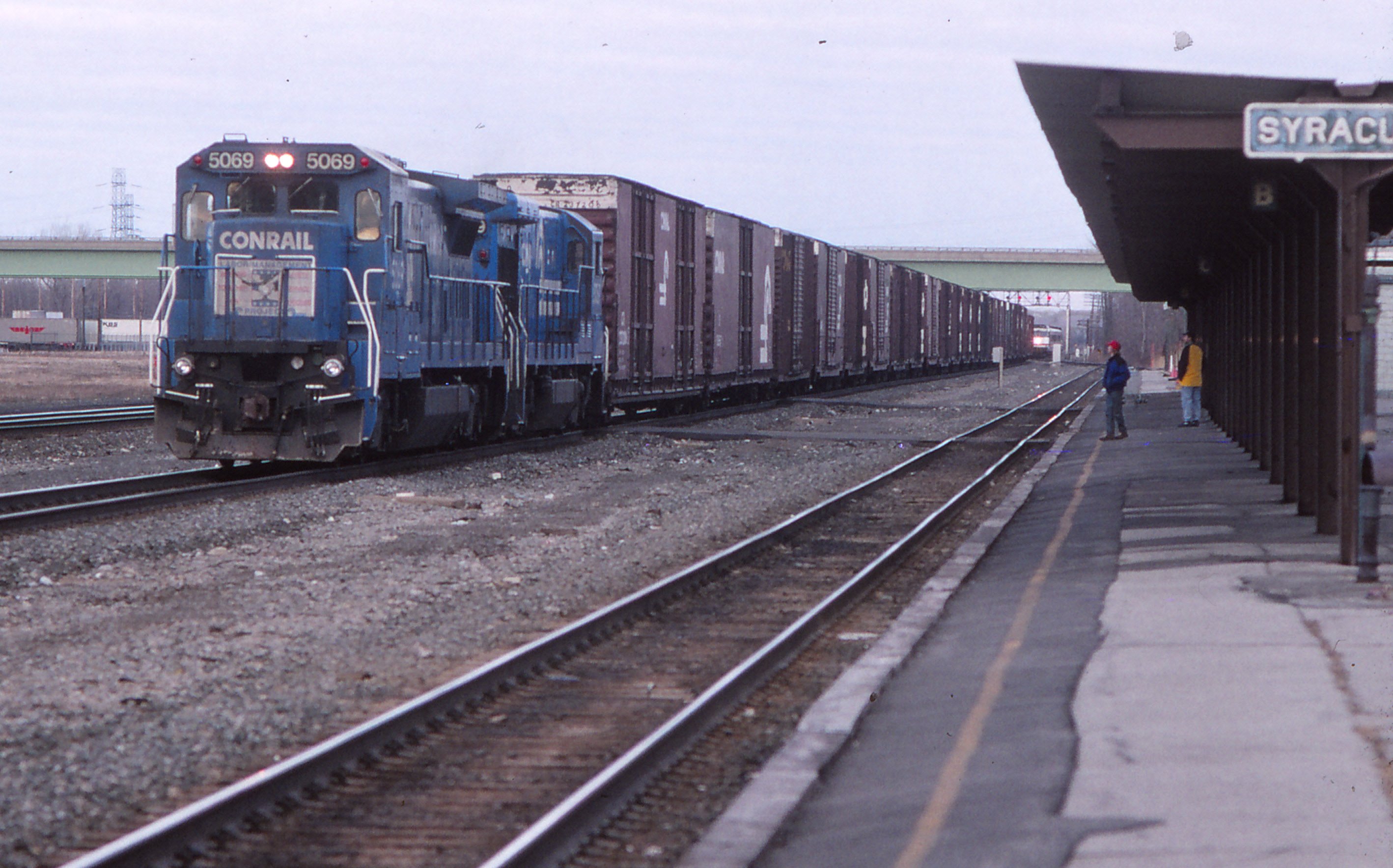 A pair of GE's, 5069 and 5059, lead 112 cars of what looks like SETO through Amtrak's Syracuse station. An Amtrak Turboliner is poking its nose around the freight as it approaches the station.