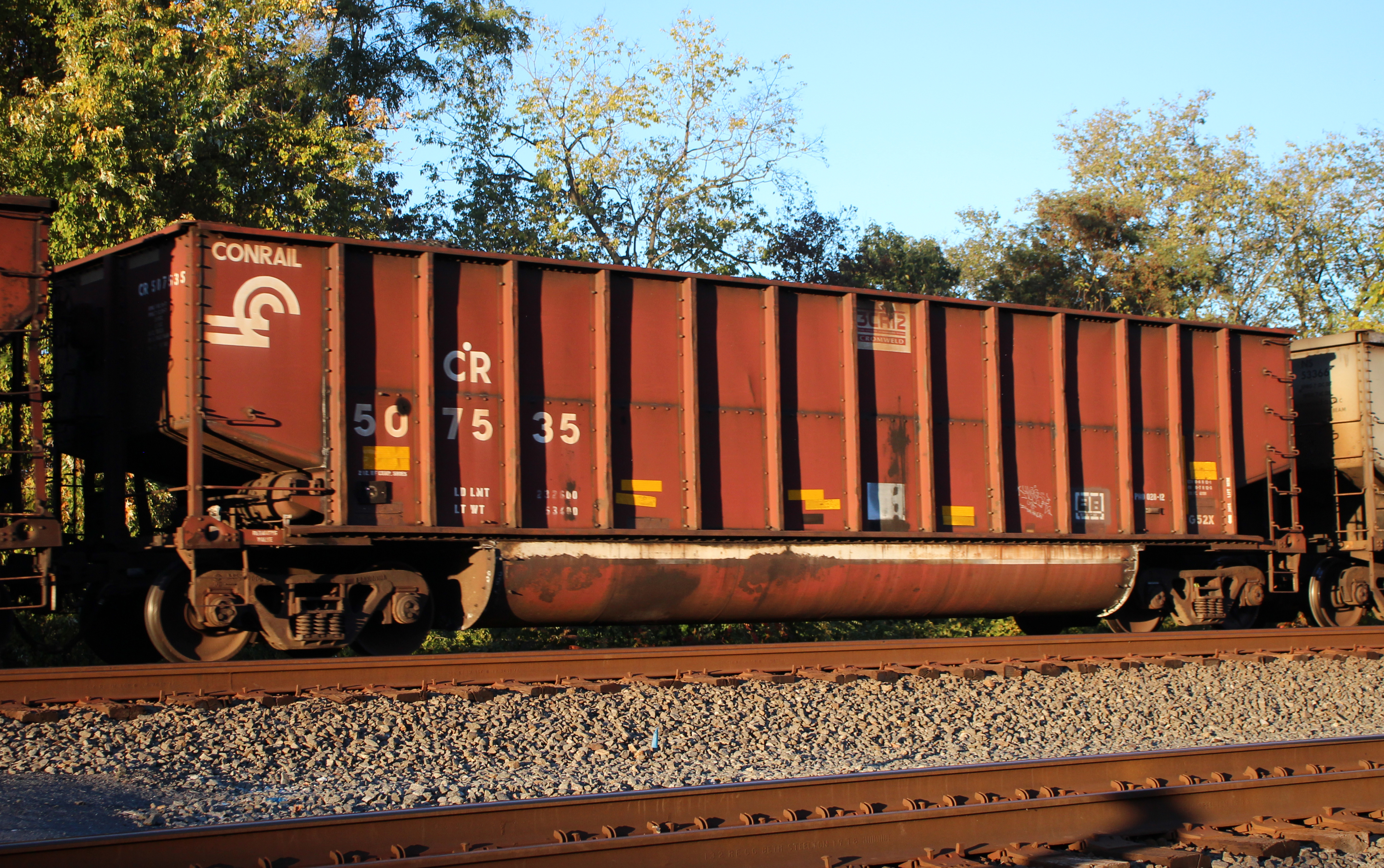CR 507535 is seen in the consist of WB NS 632 at Cove, PA on 10/18/25. Car was built 8-97 (painted 8-21-97) by HCS.
