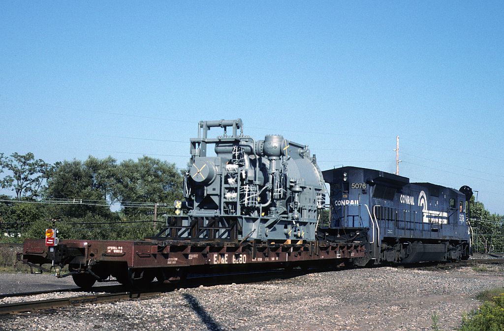 A dimension special has been put in the clear on the Akron Branch at Hudson, Ohio to let some mainline traffic pass. B40-8 5076 has but one car in tow, EJ&E 6280.