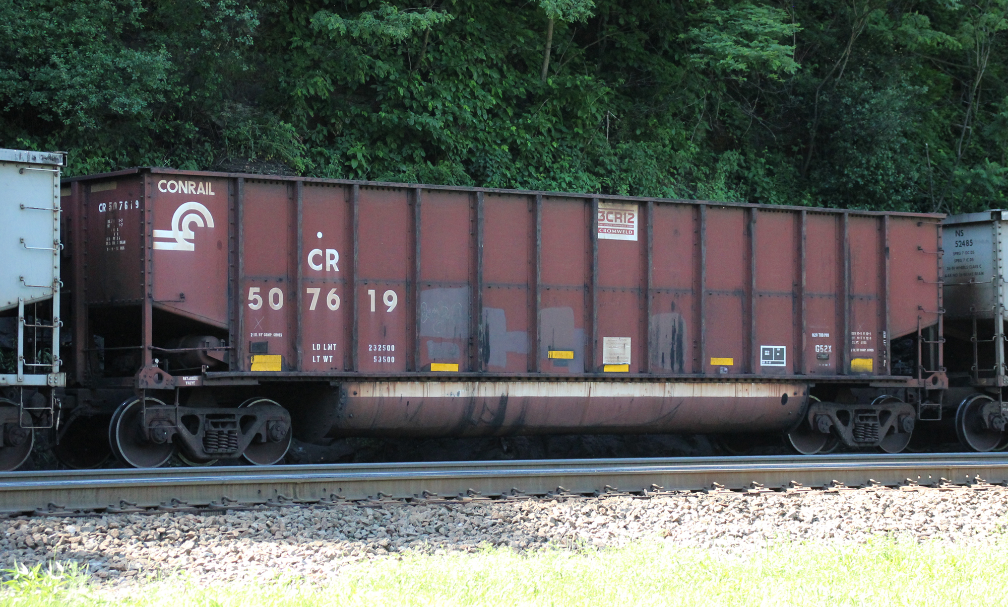 CR 507619 is seen in the consist of NS Y91 as it rounds Horsehoe Curve in Altoona, PA on 6/17/22. Car was built 9-97 (painted 9-11-97) by HCS.
