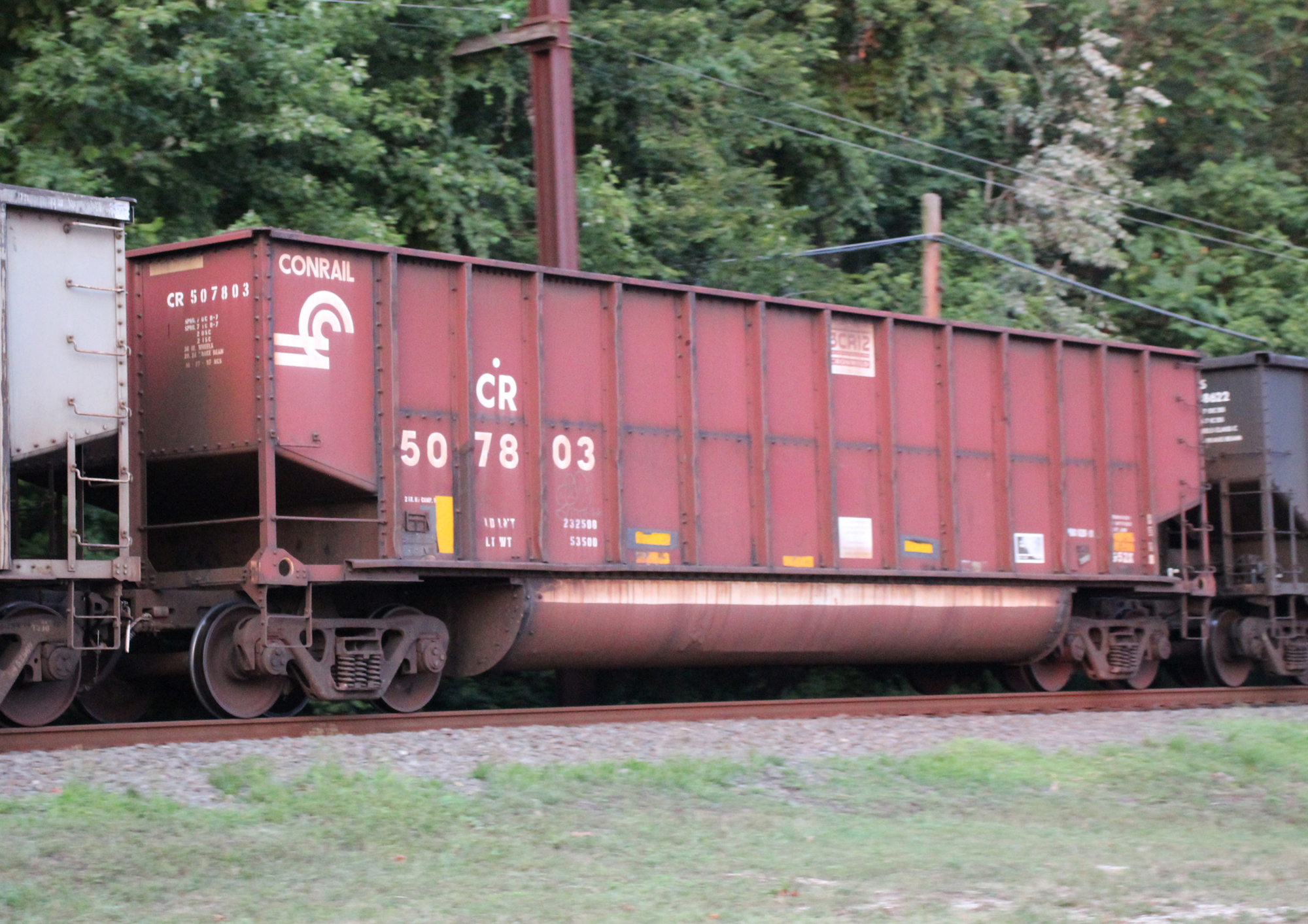 CR 507803 is seen in the consist of NS 595 at Port Deposit, MD on 7/28/24. Car was built 10-97 (painted 10-27-97) by HCS.
