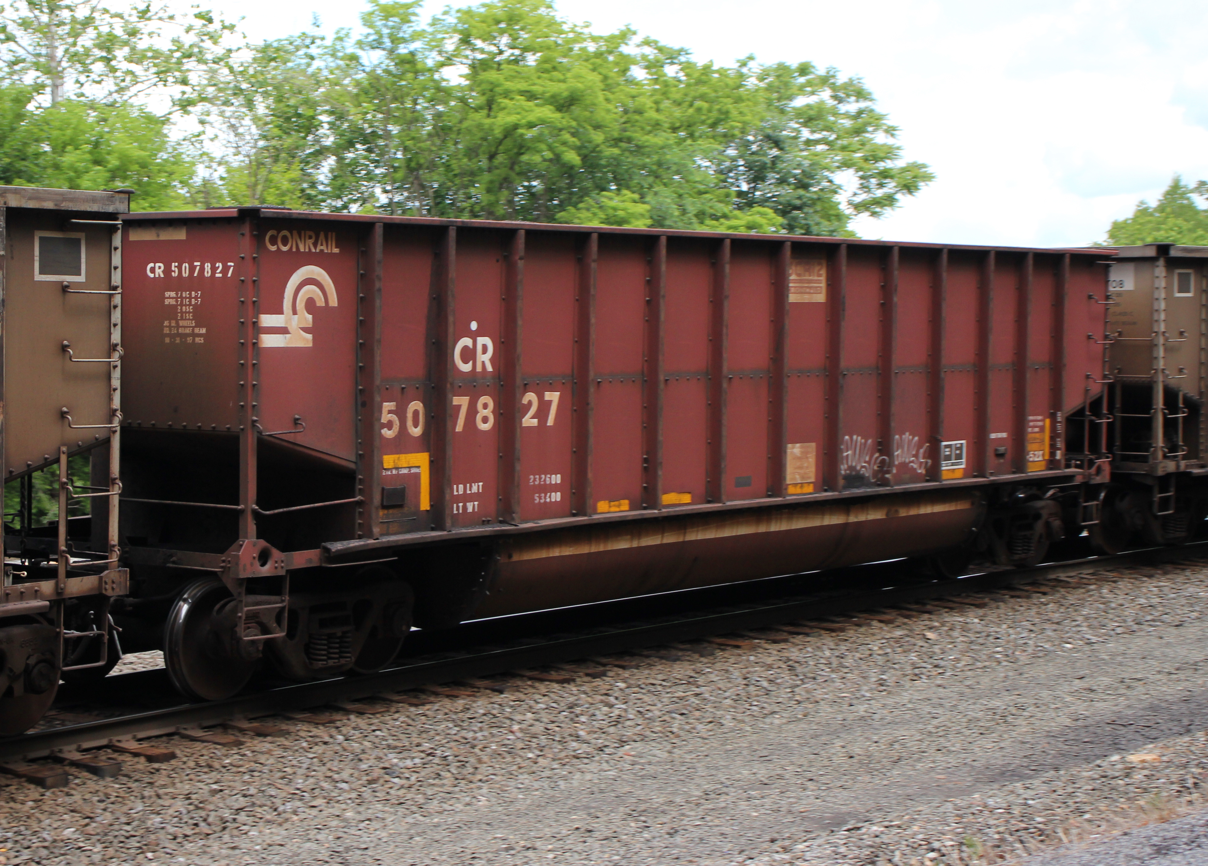 CR 507827 is seen in the consist of NS 595 at Tyrone, PA on 6/25/23. Car was built 10-97 (painted 10-31-97) by HCS.