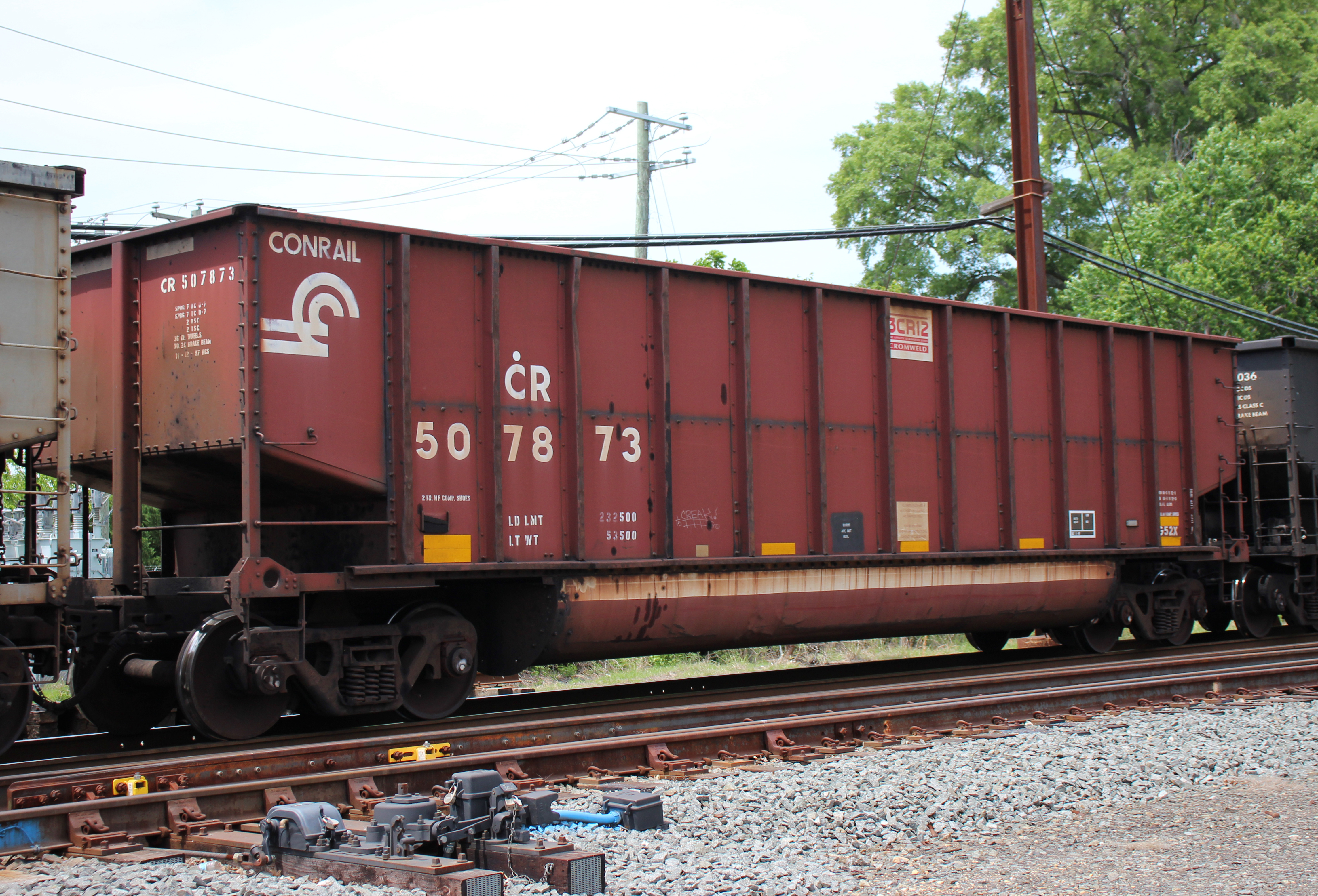 CR 507873 is seen in the consist of NS Y97 at Perryville, MD on 5/11/23. Car was built 11-97 (painted 11-12-97) by HCS.