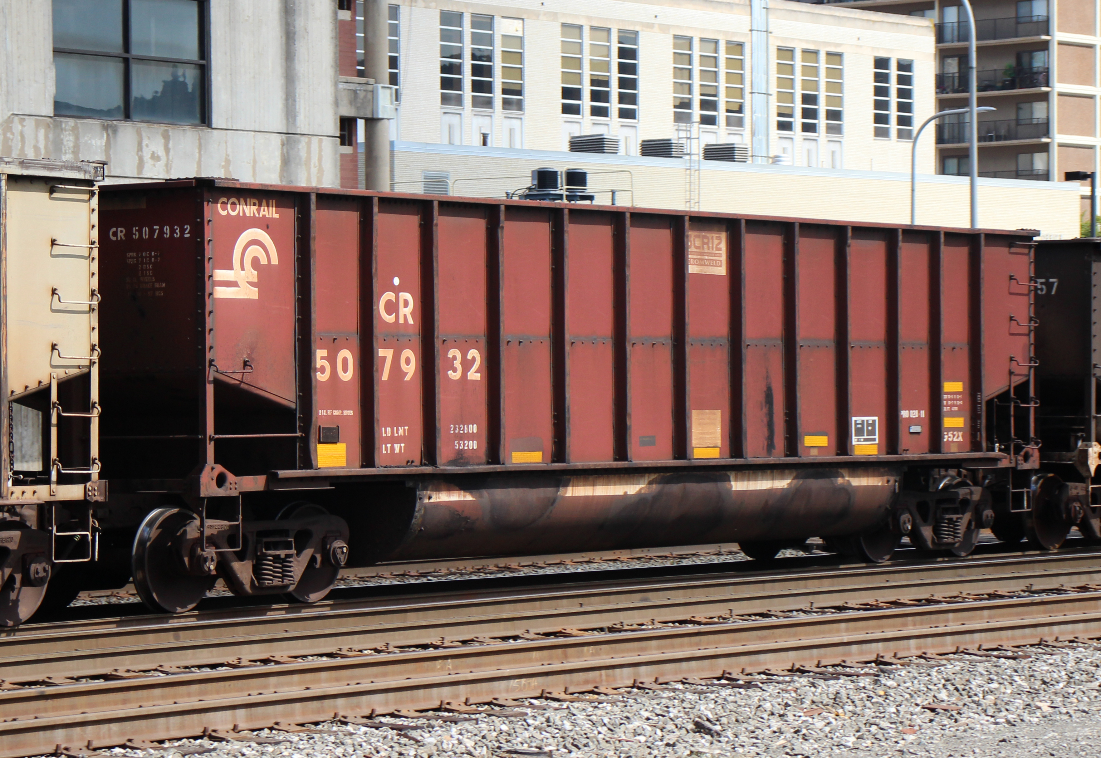 CR 507932 is seen in the consist of NS 591 at Altoona, PA on 8/11/24. Car was built 11-97 (painted 11-26-97) by HCS.