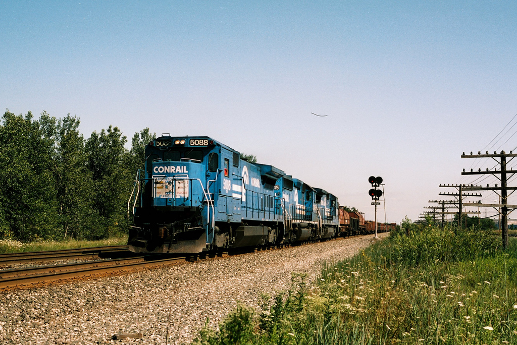 A Conrail freight is seen westbound at the Clarke Road grade crossing on the Chicago Line behind B40-8 No. 5088, in September 1992. Doug Davidson photo with permission