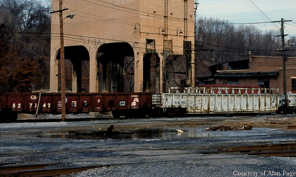 MOW gondola CR 64951 and CR 527342 rest at the Bethlehem engine terminal in April, 1984.