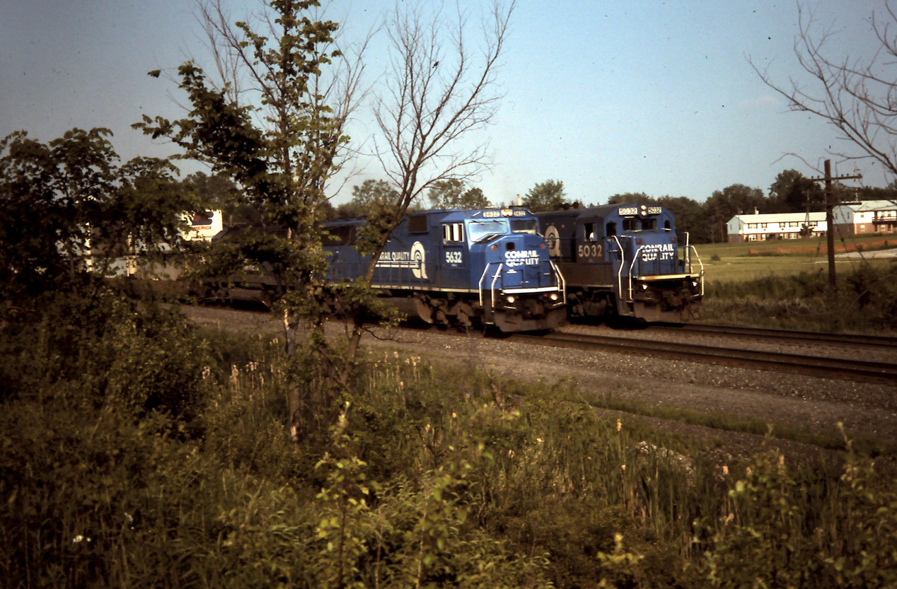 CR 5632 with TV11 in tow passes the stopped TOEL-1X with CR 5032 on the point at Bryan, OH on June 11, 1997.