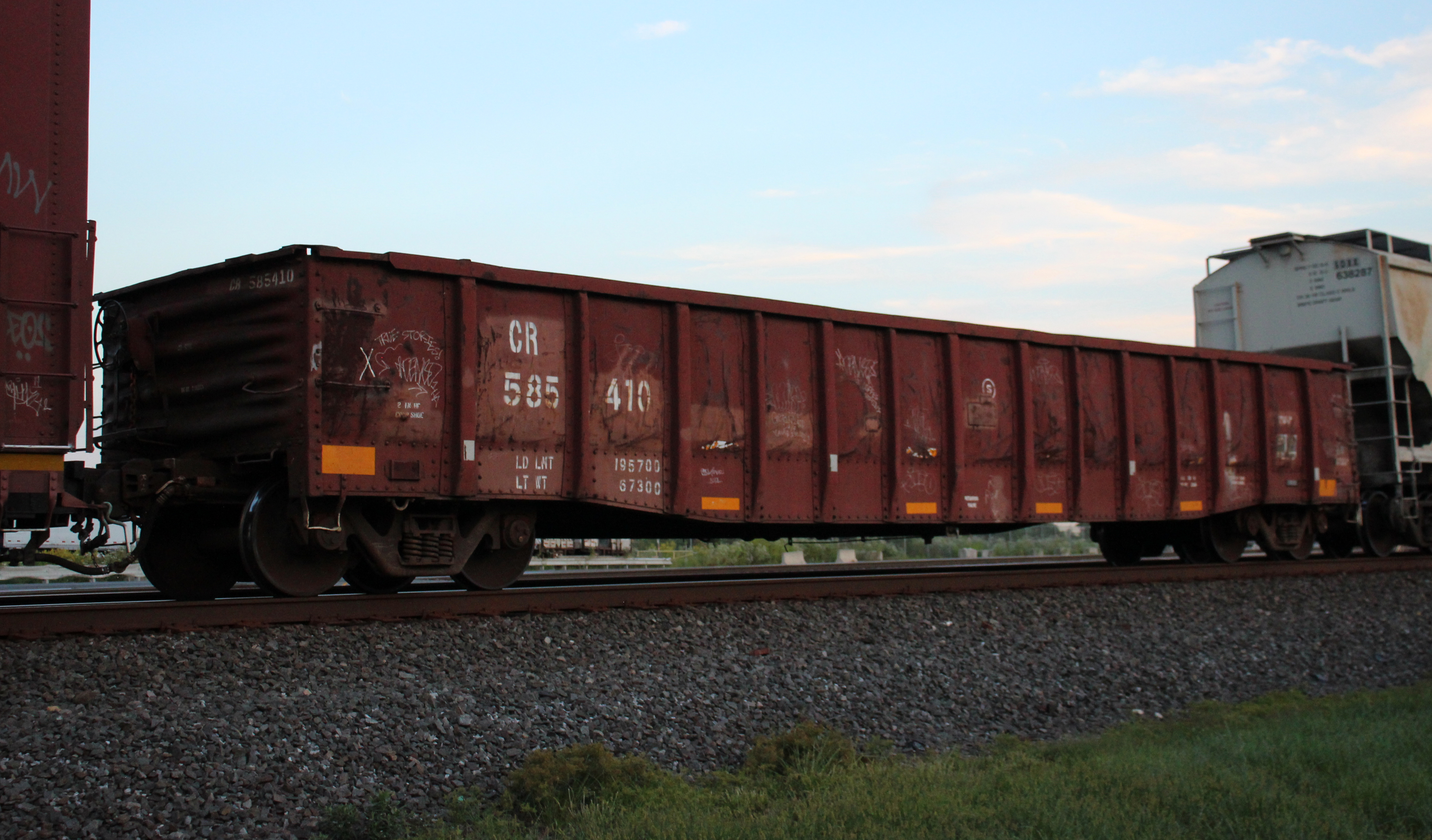 CR 585410 is seen in the consist of NS 13R at Lucknow, PA on 9/4/21. Car is ex B&O 370948 and was built 12-70. It is 1 of only 3 cars active from the CR 585400-585420 series that was made up of former CSXT ex B&O & L&N gons and is assigned to MOW service.