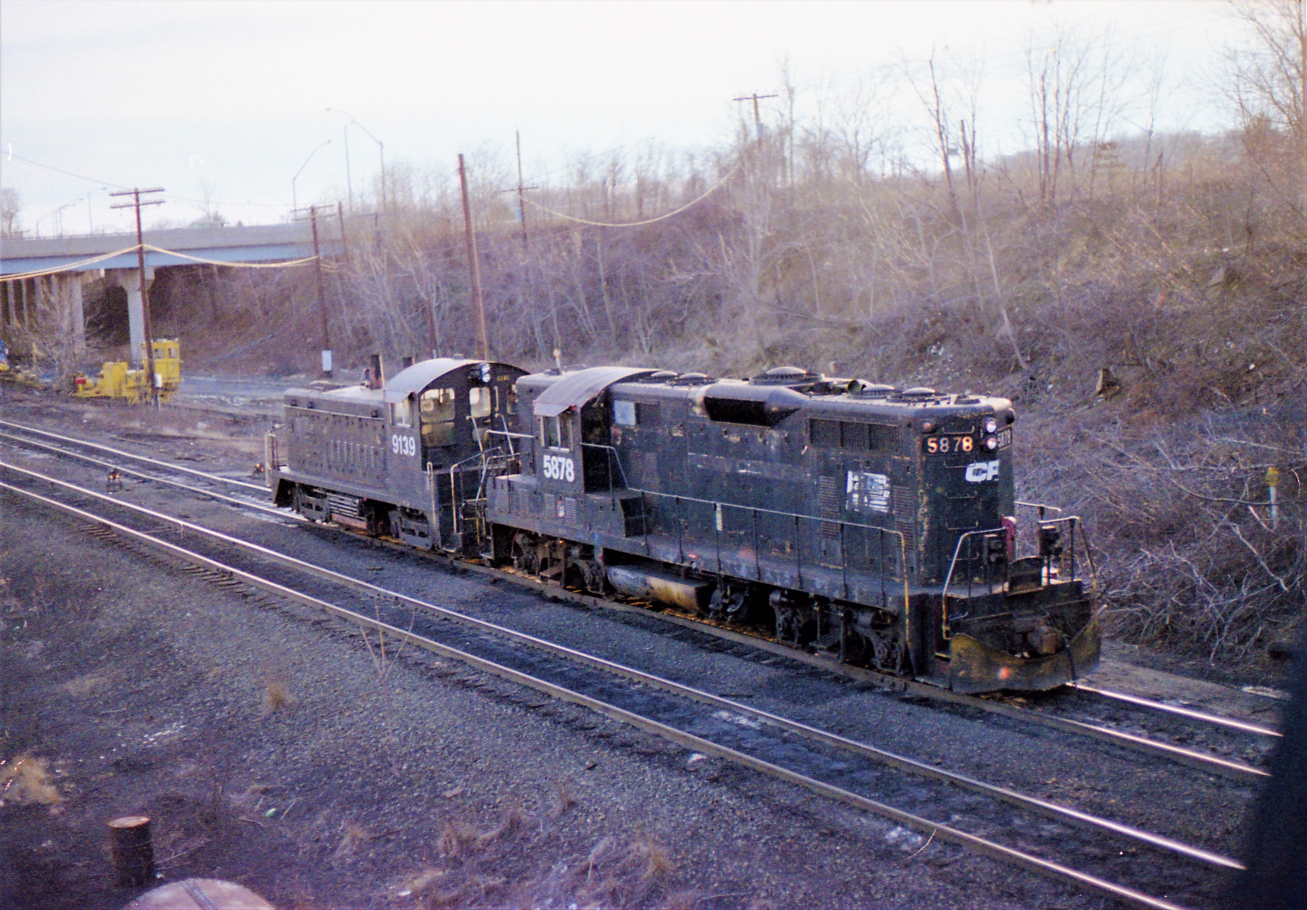 Conrail. Enola, PA, ex Penn Central GP-9 #5878 & SW-9 #9139 in a light engine move on October 31, 1979. The Iron Bridge provided many photo opportunities over the decades.