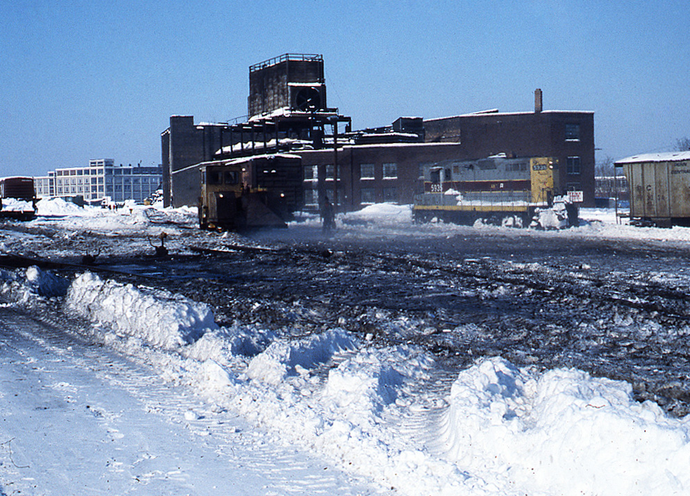 5935 moves thru the East end of Goodman Street Yard while a snow jet crew melts snow at a switch.