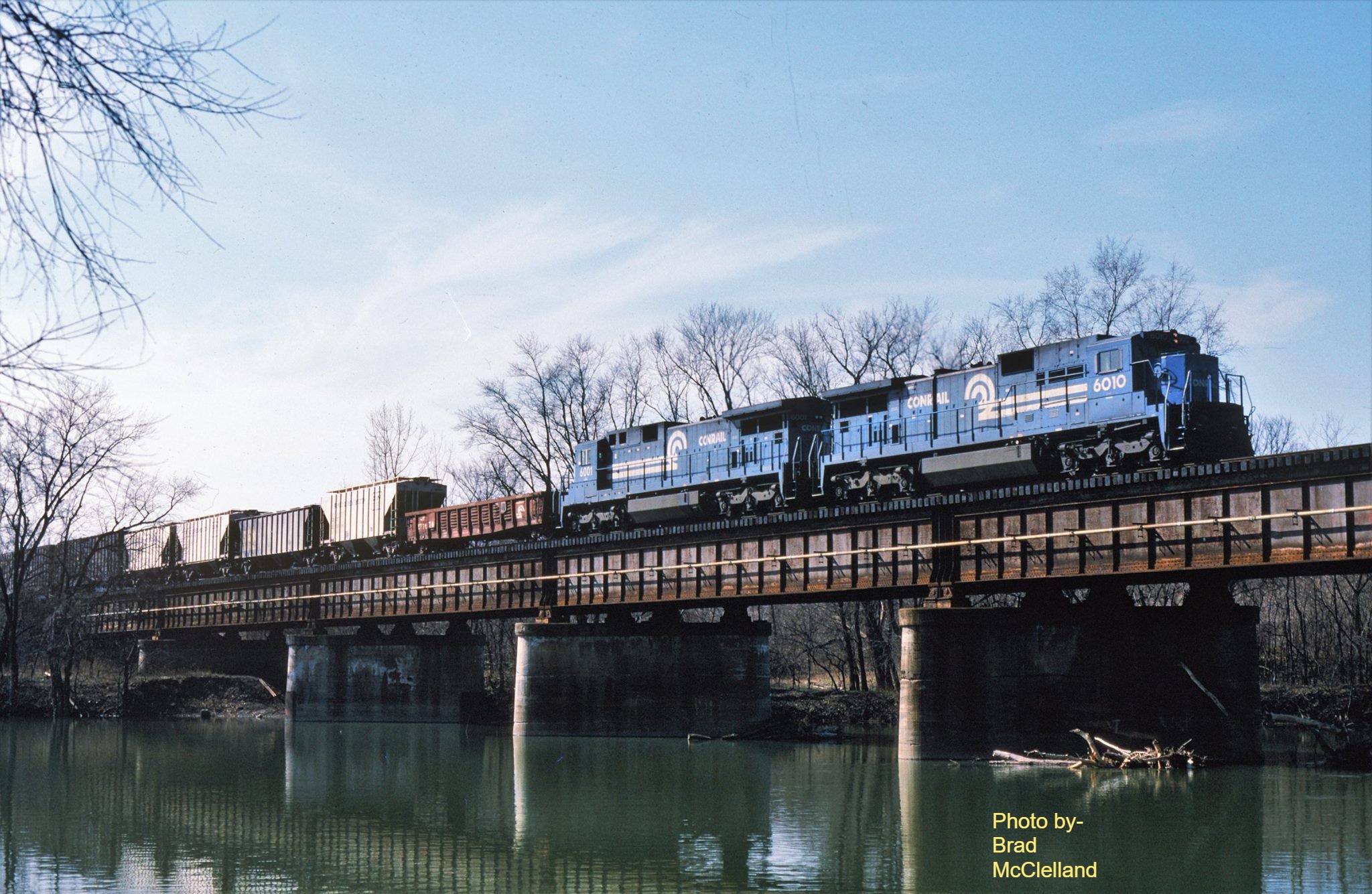 Two GE C39-8's 6010 and 6001 are pulling 105 cars on CSCO-8 ( CSX-Cincinnati to Buckeye-Columbus ) in Miamisburg, Ohio. CSCO is crossing the Great Miami River on Conrail's Cincinnati Line on Saturday February 18, 1989 at 11:50 am.