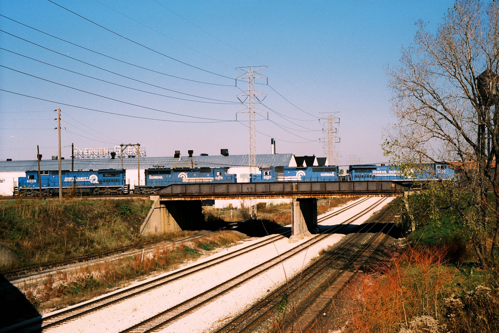 In a view from the BN Hill Track near Western Ave Chicago, IL, light Conrail power(CR 6028, 6478, 3357, 6226) heads east on the former CB&Q after having delivered a train to Cicero yard in November 1998. Doug Davidson photo with permission
