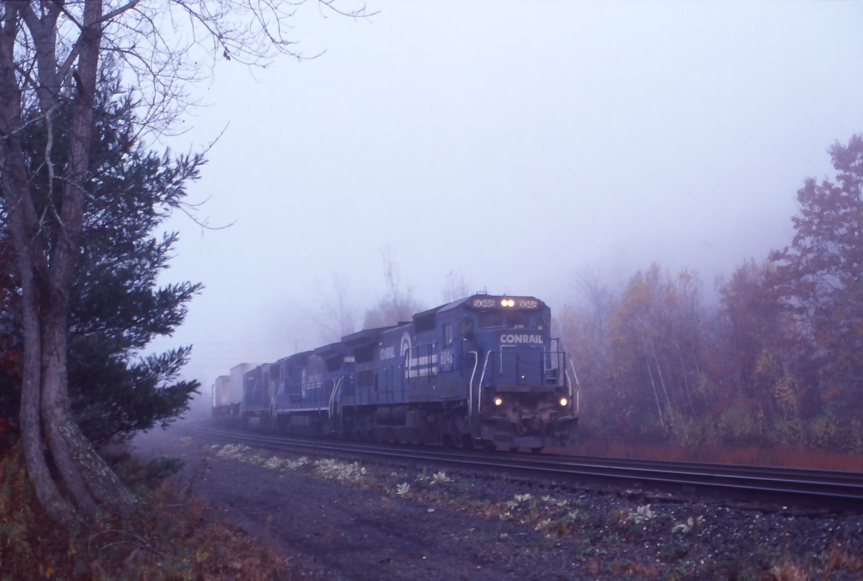 C40-8 6046 cuts through the morning fog with TV-6 at 09:02, having just crossed the State line from Canaan, NY. on Oct. 17, 1998.