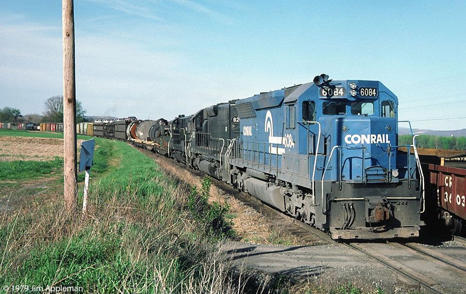 An eastbound freight with CR 6084, 6262, & 2545 is stopped on Muncy Siding for a westbound freight to pass