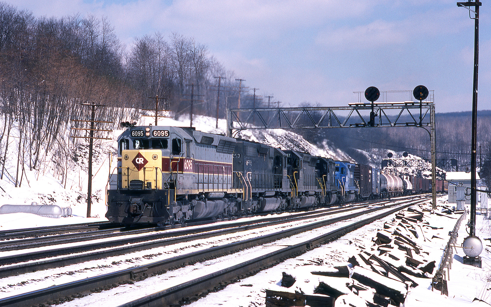 Patched SD45 No. 6095 leads a westbound manifest upgrade through Benny Interlocking at Bennington, PA on 3/18/78.