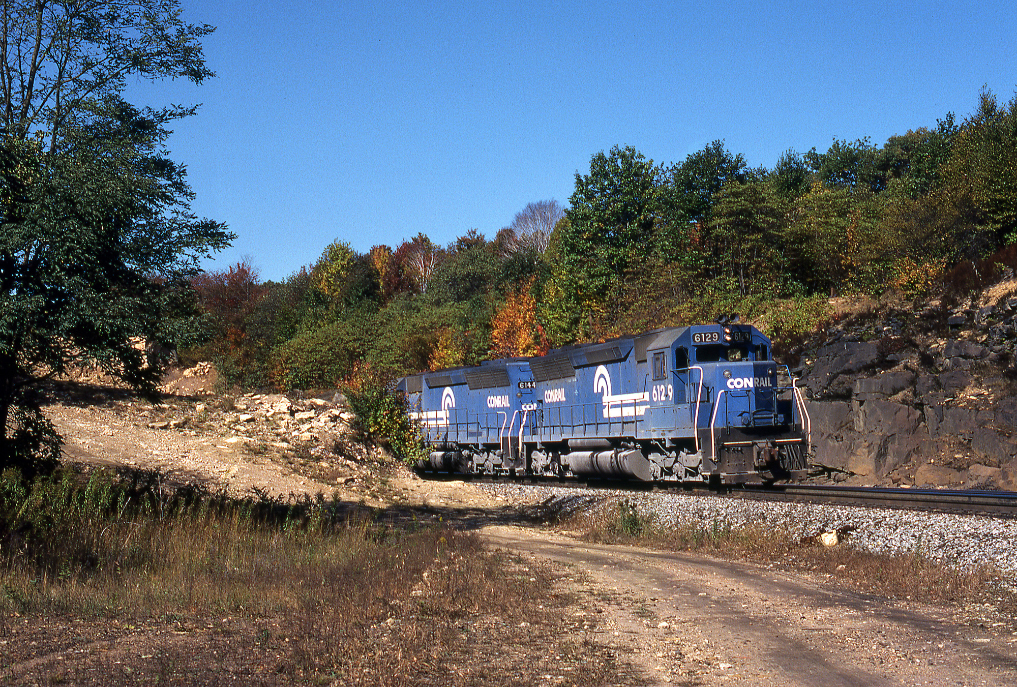 Its push done, a Conrail light helper drops downgrade at Bennington, PA on 10/15/79. For me, a pair of SD45s on a helper was always a treat.