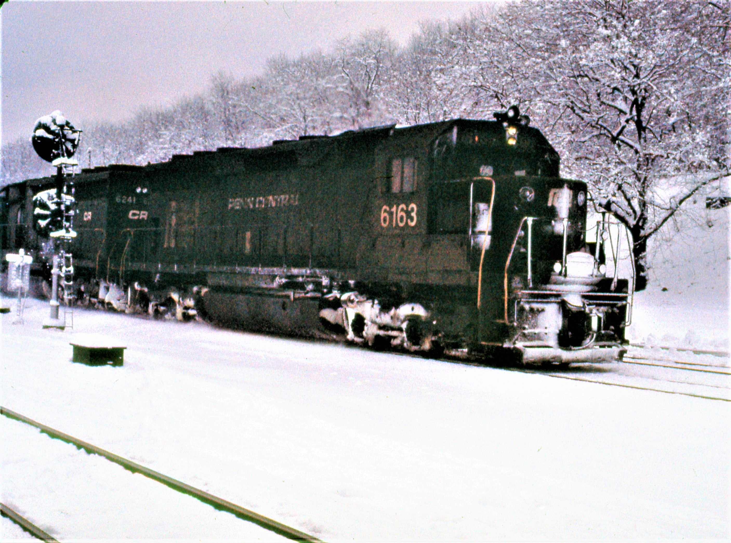 Conrail. ex Penn Central SD-40 #6163 & #6241 on westbound freight at Lewistown, PA in the snow in February 22, 1977.