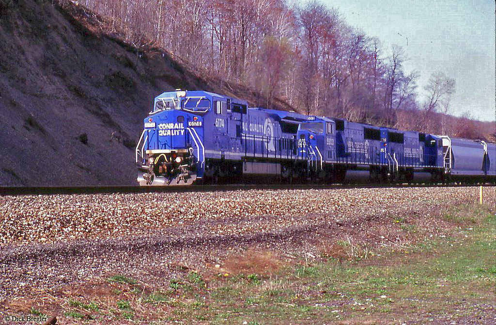 Conrail C40-8W 6174 is seen leading a westbound freight at the Brickyard in Altoona, PA in 1993. Seeing 3 gleaming new blue 6-axle units on a train really exemplifies what Conrail became.