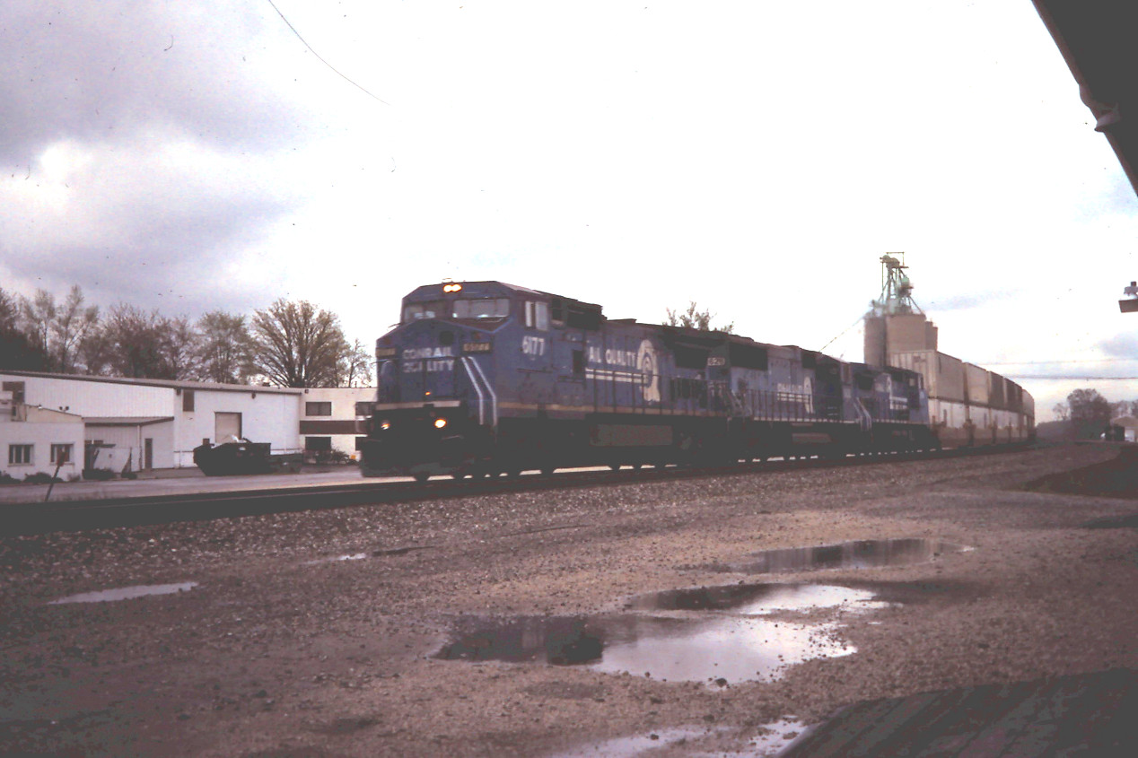 CR 6177, 5629, and a GE leads a westbound TV train at Oak Harbor, OH on a rainy April 26, 1998.
