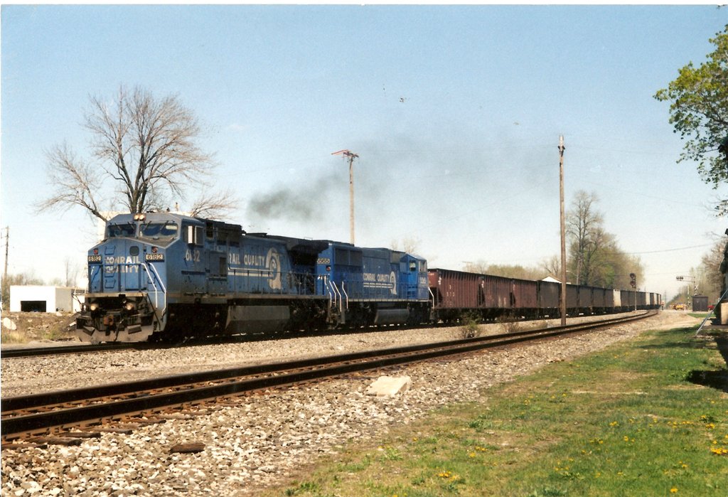 An empty hopper train is making its way through Berea, OH in early May of 1997. Leading the consist are CR C40-8W 6182 and CR SD60M 5565. This westbound train is just about to pass Berea tower (CP-194 Chicago Line) and has just come off Cleveland's "Short Line" or "Belt line" (as some call it). It is taking the connecting track over to the Chicago Line. Things look very different now; The start of the Indianapolis Line (in the foreground) is now the double tracked CSX main. The original GRS "Type G" signals in the picture are also gone. The Chicago Line is now NS. The connecting track is still in place and fully signaled, but has been used almost never in the last 10 years (except for occasional derailment reroutes and maintenance equip storage). The former "Big Four" sandstone depot is just to the right of the photo edge, just out of sight.