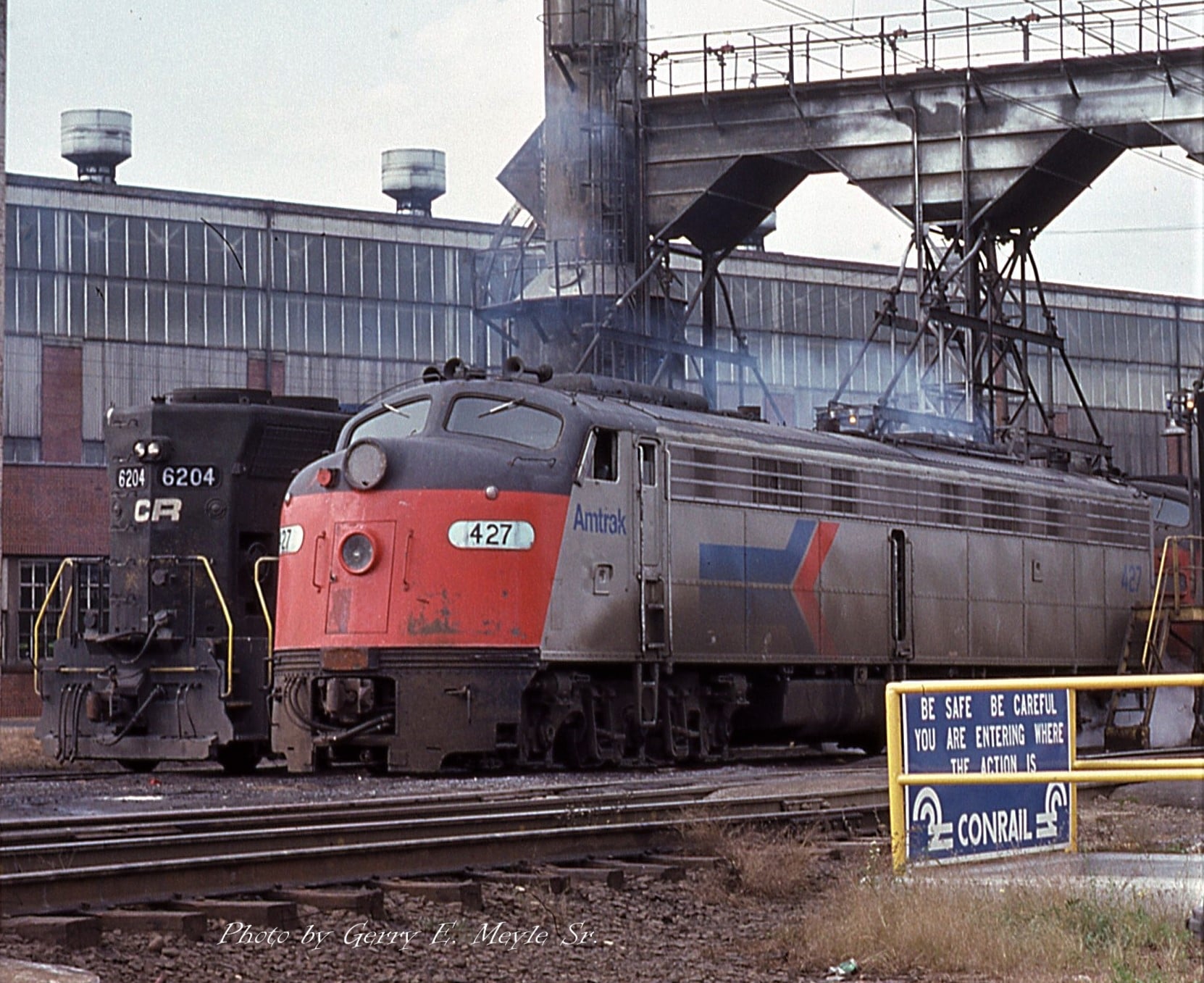 Amtrak E9A 427 ex UP 954 with Conrail SD45 6204 ex PC ex PRR at Harrisburg, Pa. November 1977.