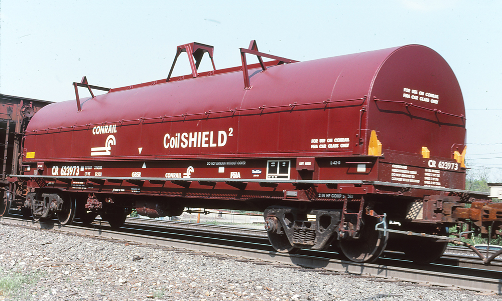 CR 623973 is seen in BAPI-4 passing the Brickyard at Altoona, PA on 5/15/98. Car was built 10-97 by Thrall.