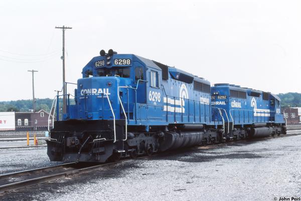 Former PC SD-40 6256 at the tail end of a quartet of CR units rushing piggybacks through Altoona in August, 1977.