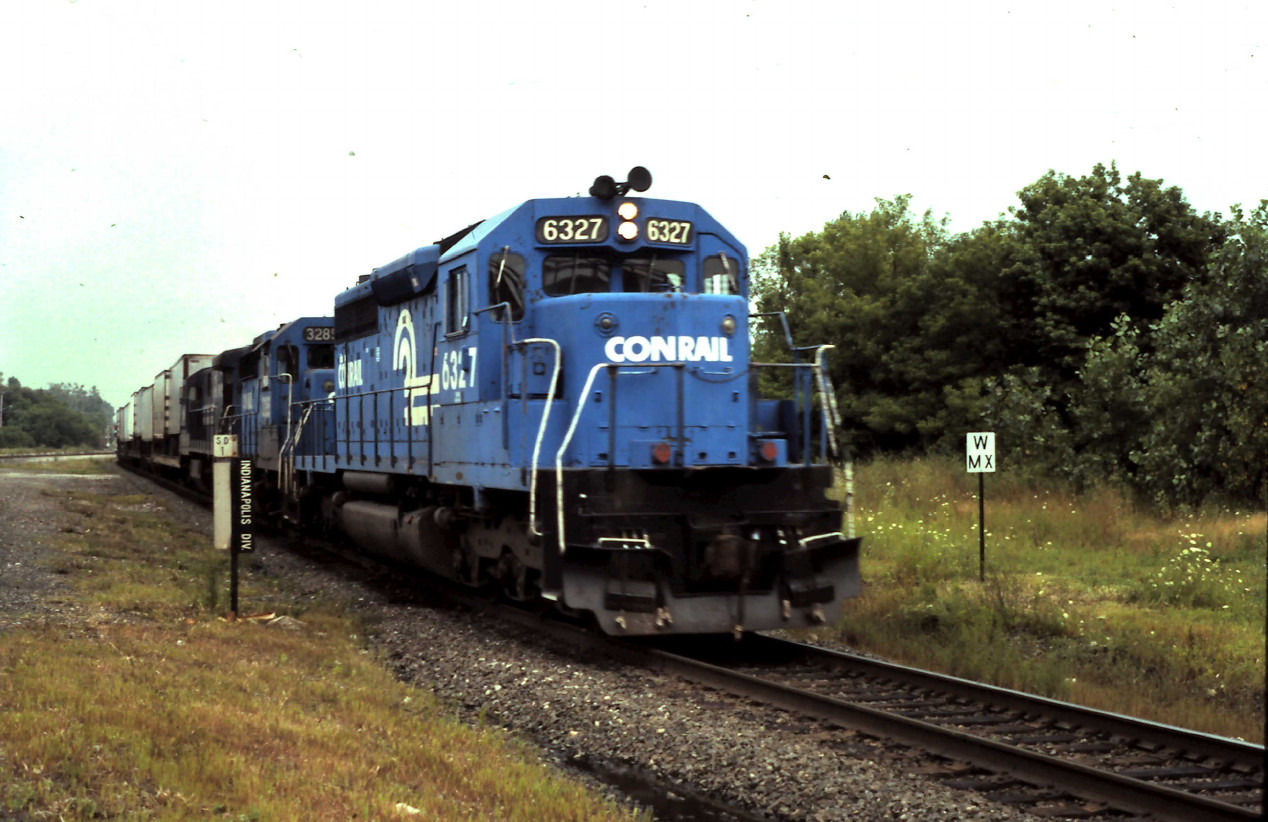 CR 6327, 3285, and 6569 lead a westbound TV train past the Indianapolis division post marker at Crestline, OH on August 15, 1992. Photographer unknown, Chris Howe collection