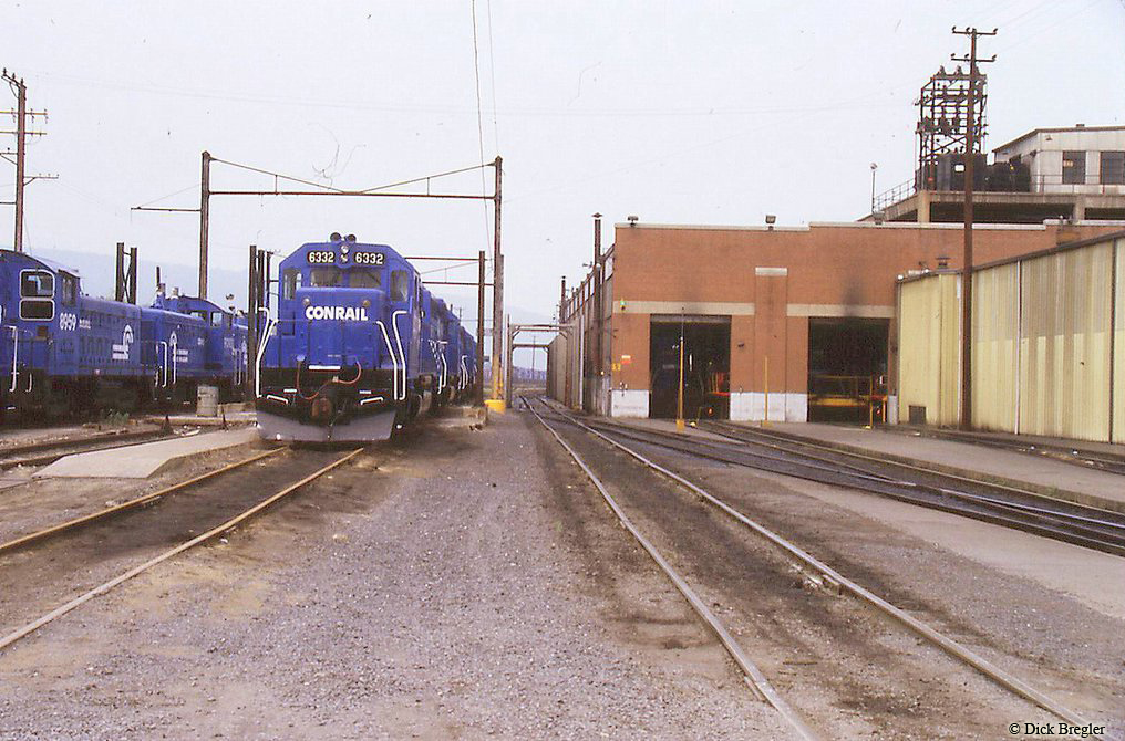 Conrail SD40 6332 is seen sitting outside the diesel shop at Enola Yard in 1986. SW9 8959 is sitting in a line of switchers with their stacks capped.