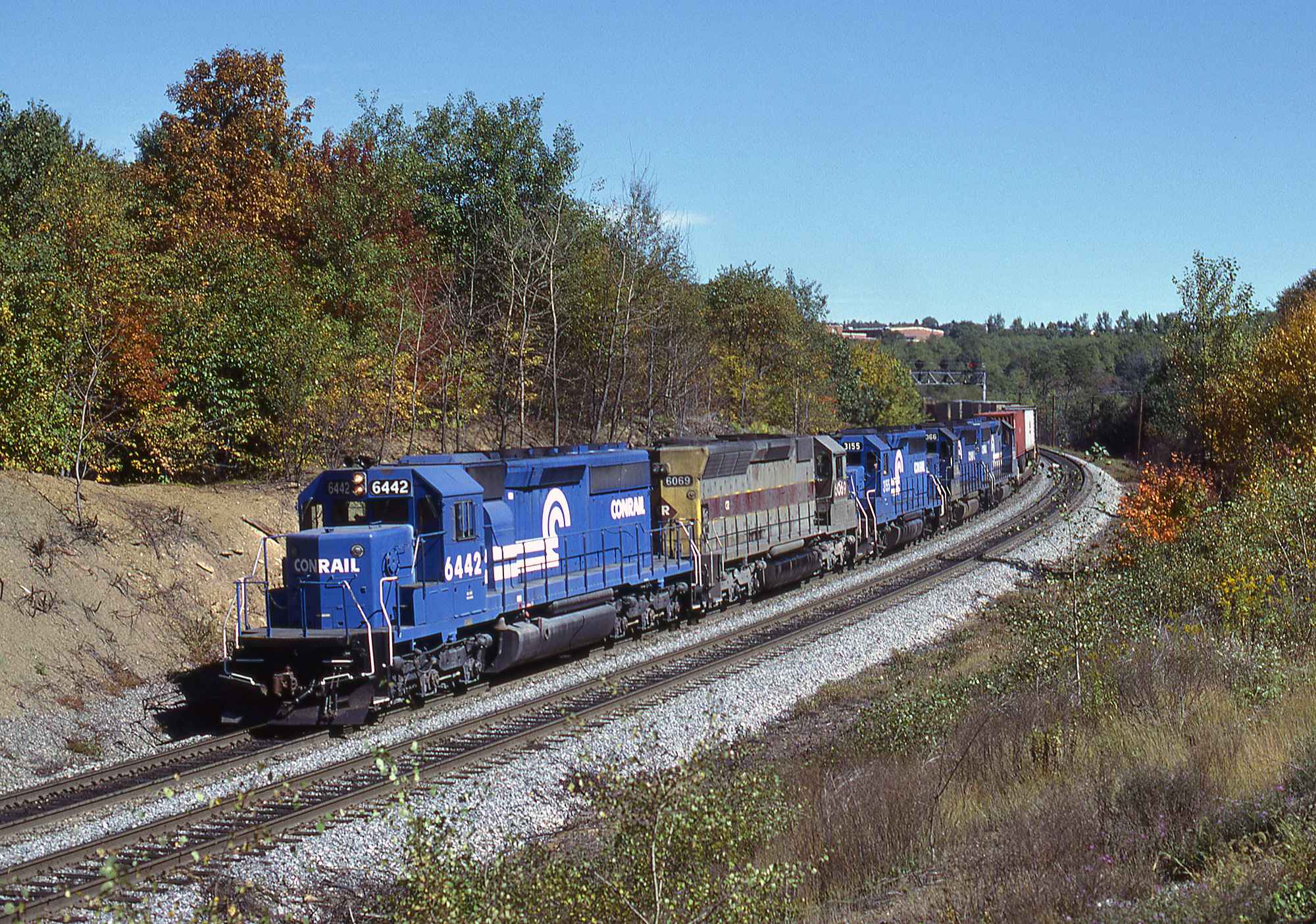 WB Conrail TV train, led by SD40-2 No. 6442, Gallitzin, PA, 10/2/82.